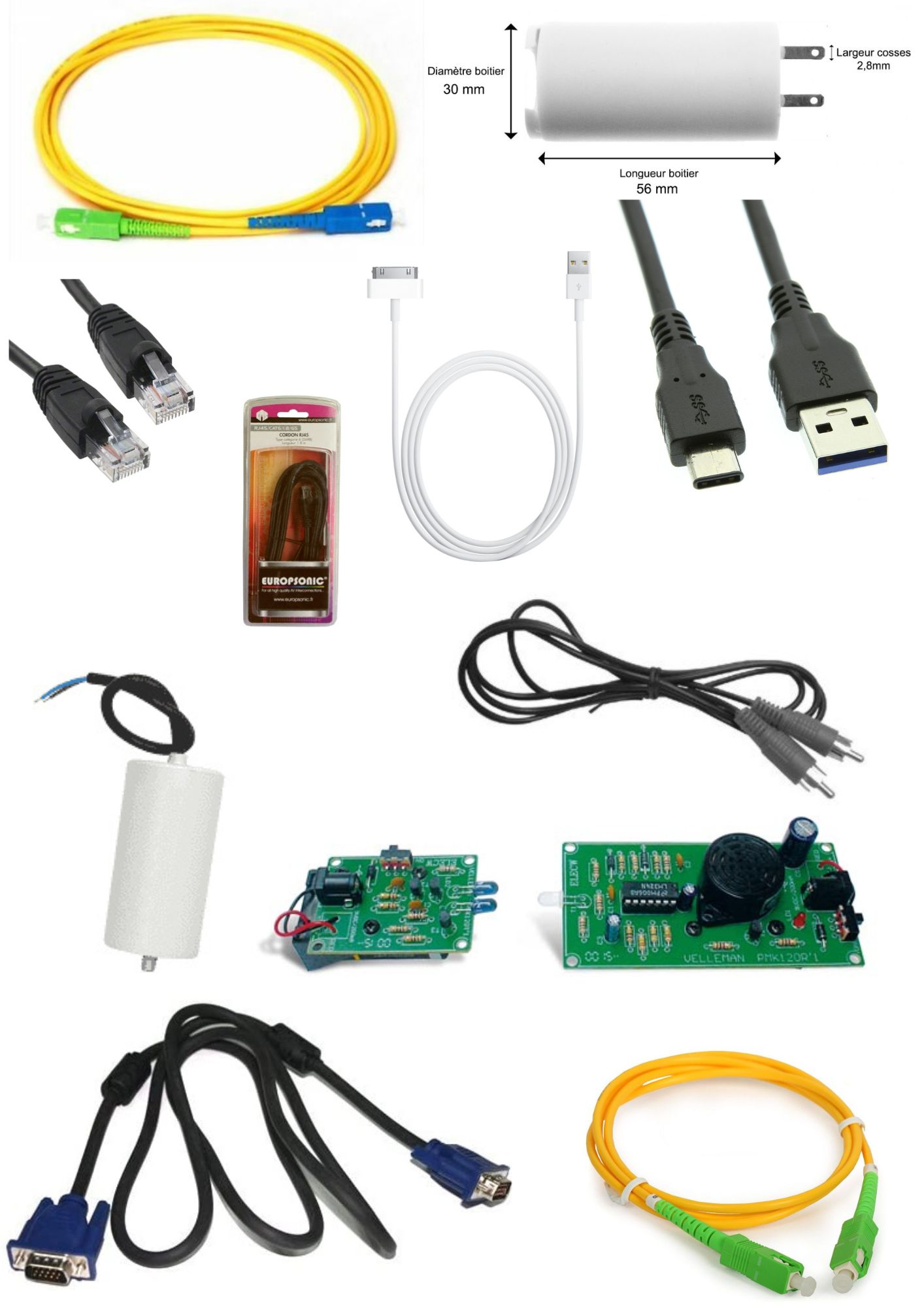 - Cordons fibre optique (Orange, SFR, Free, Bouygues)